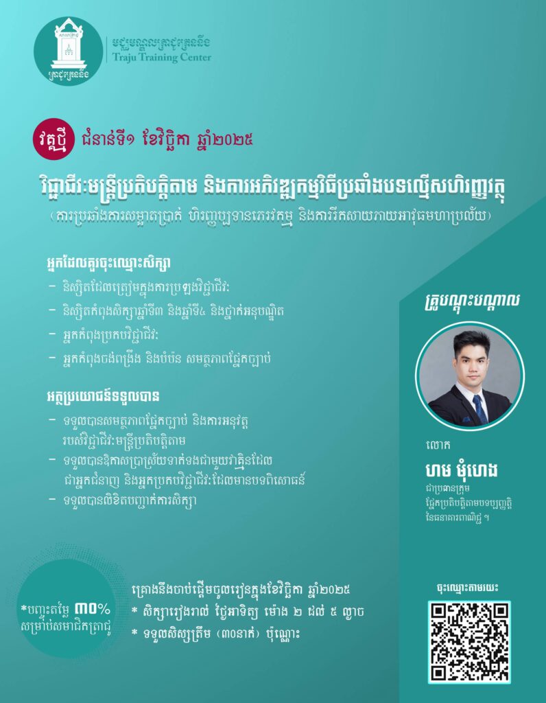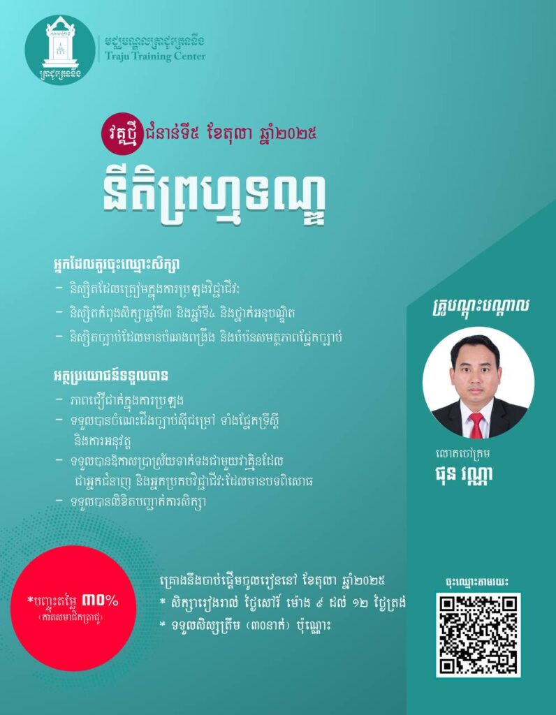 ត្រាជូត្រេននីង គ្រោងនឹងចាប់ផ្ដើមវគ្គសិក្សាស្ដីពី«វគ្គខ្លីសម្រាប់បំប៉នផ្នែកច្បាប់៖ នីតិវិធីព្រហ្មទណ្ឌ » ដោយគ្រូបណ្ដុះបណ្ដាល…