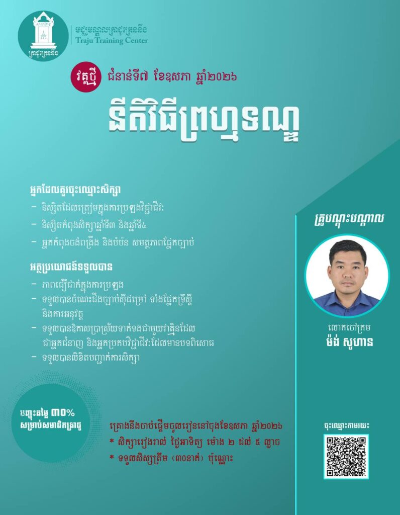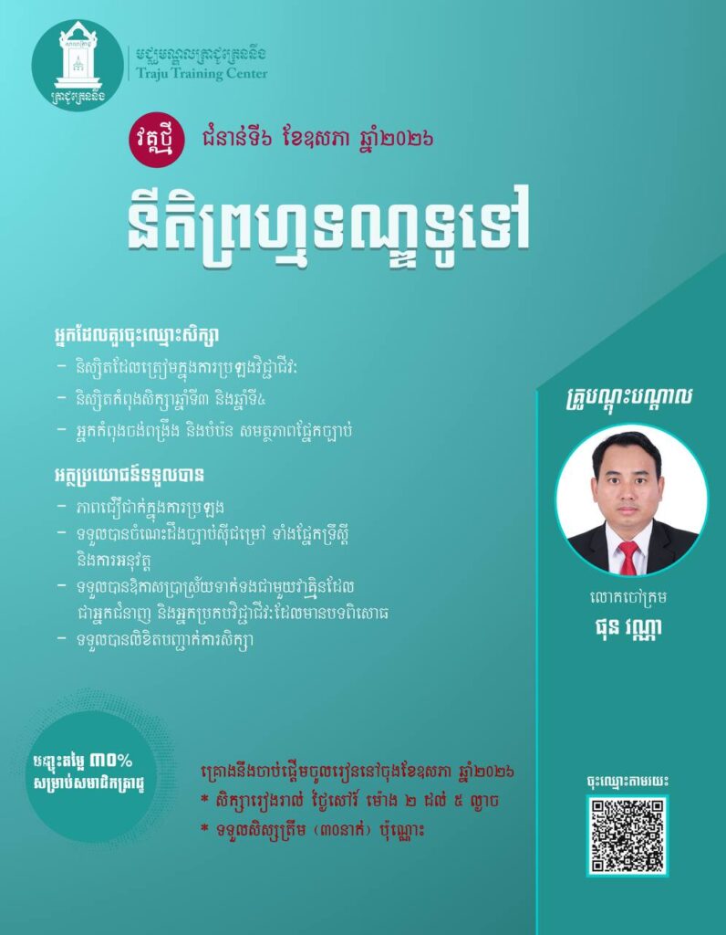 ត្រាជូត្រេននីង គ្រោងនឹងចាប់ផ្ដើមវគ្គសិក្សាស្ដីពី «វគ្គនីតិរដ្ឋប្បវេណី៖ការអនុវត្តកាតព្វកិច្ចគូភាគីក្នុងកិច្ចសន្យា» ដោយគ្រូបណ្ដុះបណ្ដាលសាស្រ្តាចារ្យបណ្ឌិត ព្រុំ…