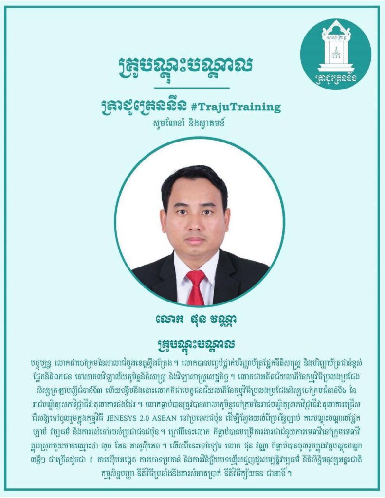 ត្រាជូត្រេននីង គ្រោងនឹងចាប់ផ្ដើមវគ្គសិក្សាស្ដីពី«នីតិព្រហ្មទណ្ឌ» ដោយគ្រូបណ្ដុះបណ្ដាល លោកចៅក្រម ផុន វណ្ណា នាចុងខែឧសភា ឆ្នាំ២០២៦ ខាងមុខនេះ។